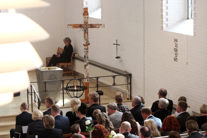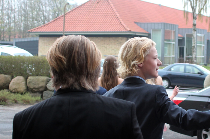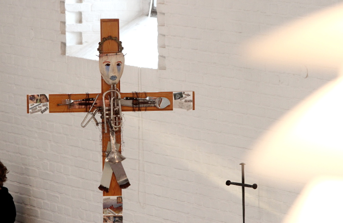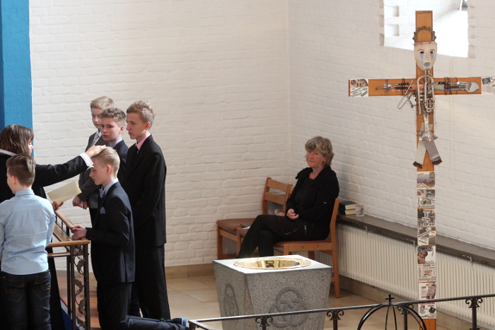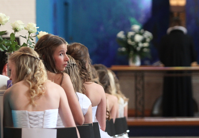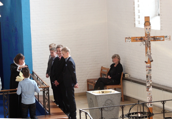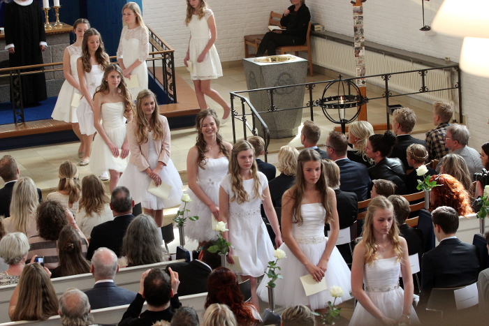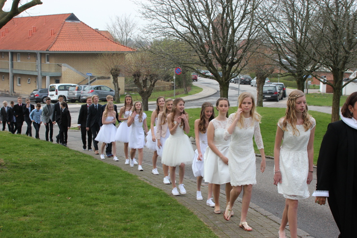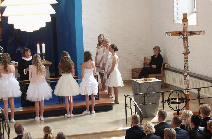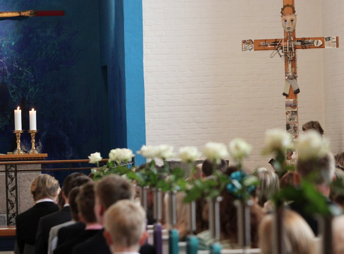 Glimt fra en af konfirmationerne i Hassseris kirke. De unge strålende af forventning og glæde og gik turen rundt om kirken, som optakt til højtideligheden. I det lyse kirkerum blev de konfirmeret under et krucifiks i skrot, som de selv havde fremstillet, ligesom der bl.a. blev sunget en salme de selv havde digtet.