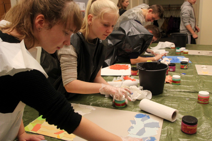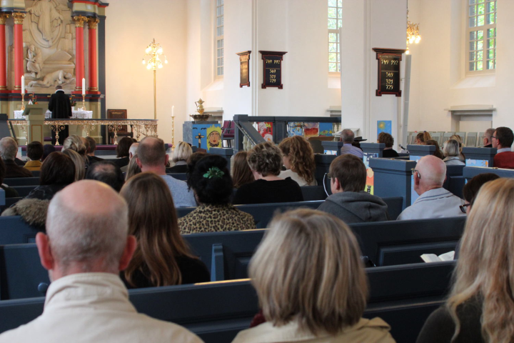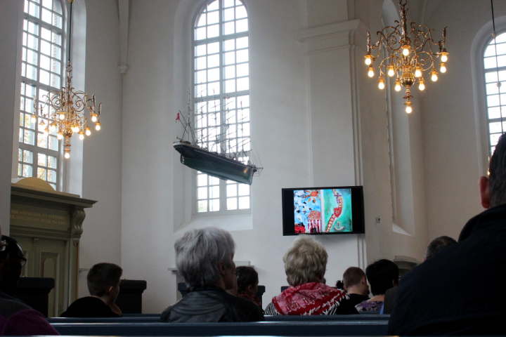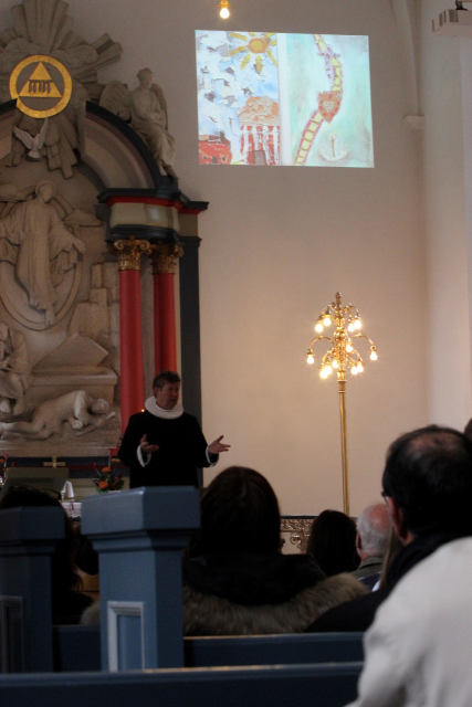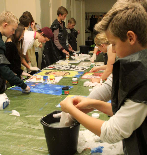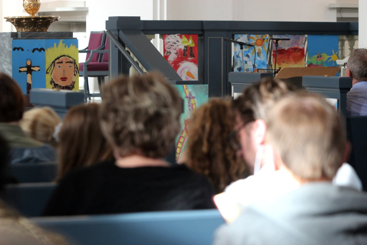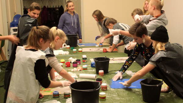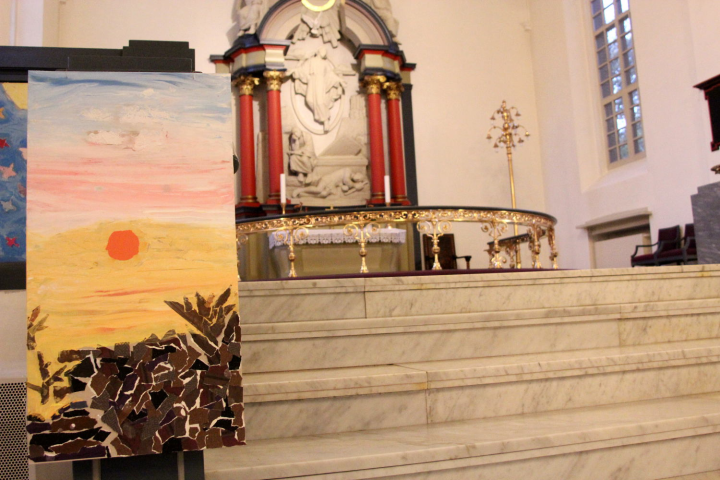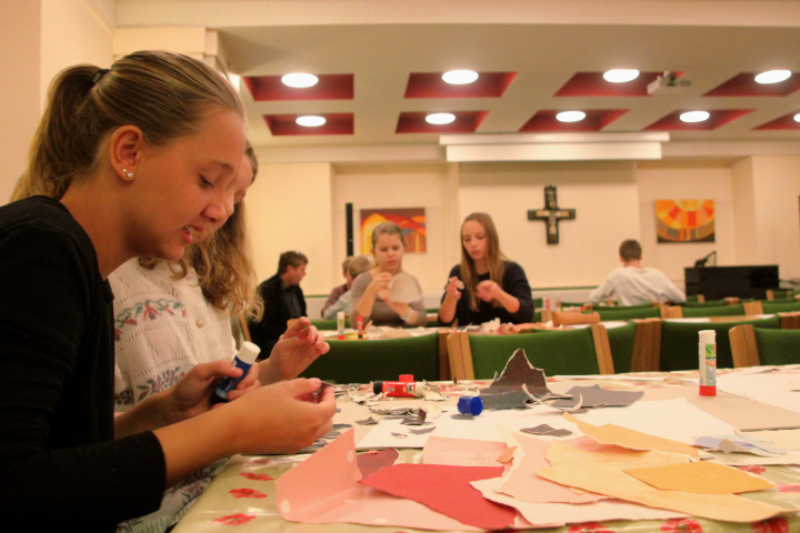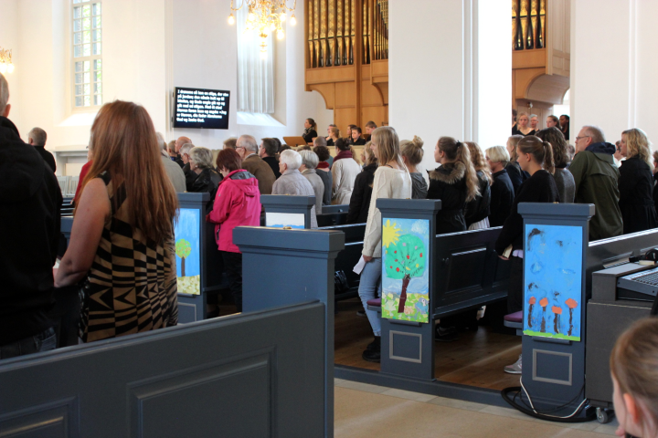 Ugens konfirmandundervisning på alle hold var i fuld aktivitet med salmebilleder, gode tanker, idérige motiver og farvesætninger. Det var efterårssalmen "Nu falmer skoven", der var temaet. De fine værker blev lavet i et format, så de kunne indfældes i kirkerummet og indgå i søndagens højmesse. De unges forældre og andre var inviteret til at deltage i "højmessefernisteringen" og præsten (Ole Kamp) fik på en nærværende måde indflettet de unges motiver ind i både liturgi og prædiken. Billederne blev også vist løbende i stort format på projektor og skærme i rummet.